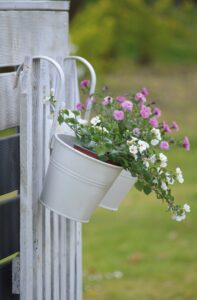 Lente : viooltjes, primula’s, narcissen in pot. Zomer : geraniums, lobelia, begonia’s. Herfst : chrysanten en heide. Winter : siergrassen of takken met bessen.