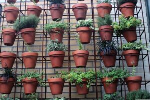 Wat werkt goed verticaal : munt, tijm, rozemarijn, sedum, klimop, of zelfs aardbeien.